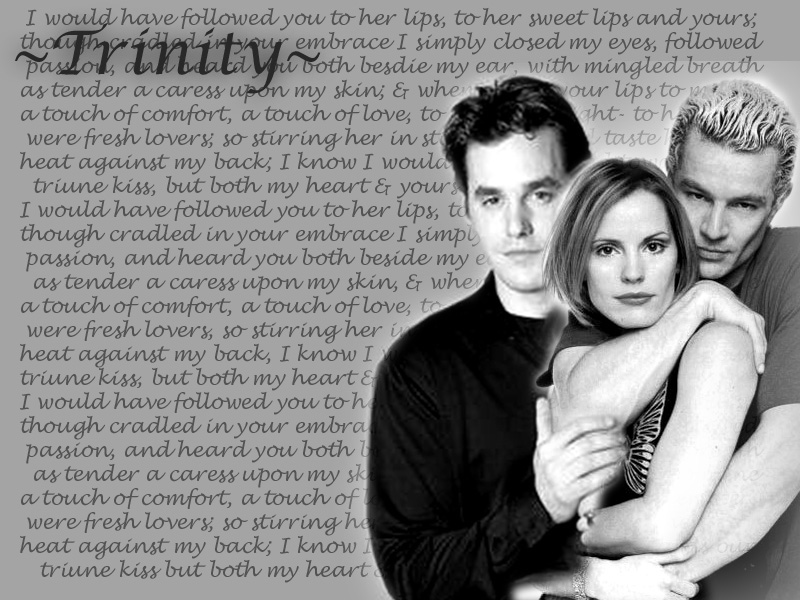 The room was dark, and Willow was sound asleep the next time Tara opened her eyes. She felt sick, her head hurt and she could feel her sinuses clogging and aching. She reached out from under the blankets for more echinacea, and the movement woke the rest of her body up. Specifically, her two glasses of juice and one mug of tea filled bladder awoke. She carefully crawled out from under the blankets and off the couch, trying not to wake Willow. It was dark in the apartment, but there was a light on in the bathroom, its door shut enough that only a crack of light spread across the hallway floor. She made her way to the bathroom, squinting against the light when she opened the door, and wished she weren't sick. She felt decidedly icky. When she'd finished in the bathroom, she didn't feel like going back to sleep -- not certain she could fall asleep again, right away, anyhow. More tea, maybe, if she could make it without disturbing anyone. She thought about how high the stovetop was. Maybe she'd get another glass of juice. If she put the echinacea drops in her juice, she wouldn't be able to taste them quite as much. And if she did it while Willow was asleep, she wouldn't have to hear 'I told you so' again. At least until next time. Thus decided, she padded across to the kitchen in her stocking feet -- extremely thankful that she wasn't wearing the footy pajamas, given the many disasters possible when you combine too much juice and a smaller-than usual bladder with one-piece zippered-up nightwear -- and reached for the lightswitch. Stood on tiptoe to reach for the lightswitch, to be accurate. She just managed to flick it with her fingertips, and the florescent light sputtered and popped on. "Eep!" At least she managed to eep quietly, Tara thought as she stared at Spike, who was sitting slouched in one of the chairs next to the little 2-person-3-if-you-squeeze breakfast-table. He blinked at her, looking not so much startled as distracted. She stared at him as his pupils contracted to pinpoints., and his eyes were all blue iris, for a second. He blinked again. Then his distracted look was replaced with one of concern. "Hey, witchling. Something wrong? You feel sicker? I can make you some tea if you like, or... emergency room's open 24 hours. God knows I've got that place memorized by now -- could drive there with my eyes closed." Tara continued to stare at him, then grinned slightly. "No thanks. Especially not the eyes-closed part." "Tea, then?" he asked, already standing up and heading for the tea kettle. She was tempted to say yes, then thought about what 'making tea' meant for Spike. She didn't think he ought to go to that much trouble...but then, she didn't want more juice. She wanted hot tea. "Thanks," she said, trying to sound as grateful as she felt. It was tricky, when her head was so stuffed up. She couldn't tell if she really sounded grateful, or just tired. She climbed into the kitchen chair beside the one Spike had been sitting in, and watched as he began to put together the tea making paraphenalia. Tara tried to figure it all out -- again -- but had to admit, secretly, that she agreed with Xander. Boiling water and adding a little bag was easier. She sat there, watching Spike work silently, until she realized he wasn't going to say anything at all. Maybe that was how tea was supposed to be made -- maybe he'd picked up tea ceremony habits or something. But she had a feeling it was just whatever he'd been thinking about, here in the dark. "Spike? What's wrong?" she finally asked. "What makes you think something's wrong?" he asked as he measured leaves into a cup. He was paying very close attention to them -- possibly afraid they would suddenly turn into a Lipton's teabag if he took his eyes off them for one second? Tara rolled her own eyes, not that he was going to catch the visual if he never looked at her. "Xander and Anya are in bed. And you're not. You were sitting in here in the dark, staring at the floor. Which -- unless you were having sex telepathically, in which case please tell me now, and I'll leave and pretend to forget I ever woke up-- seems kinda wrongish to me. Given that you're widely known to be willing to pass up a blood-soaked riot to be in bed with Xander and/or Anya." "You don't sound very regressed," he pointed out, deftly avoiding the question. So he thought. "I'm sick and I'm tired and I want my tea and I'm gonna whine at you until you tell me what's wrong and you better not be mean to me or I'll make my girlfriend turn your weewee into a doorknob," she said evenly. "There-- is that better?" He turned around from his preparations and stared at her for a second, then chuckled. He sounded tired, too. "I remember when you were the shy one." "I am the shy one. If I were Willow, I'd have used the medical Latin for weewee." The teapot chose that moment to make its presence known -- by spouting steam, since he'd thankfully taken the whistle out. Spike poured water into two cups, and added the right fixings, then carried them over to the table and sat down, falling back into that same not-quite-relaxed slouch in which she'd found him. After he'd taken a sip of his own tea, he glanced at her quickly, then looked back down at his cup. "Anya wants to have a baby." "I know. She told Xander, today." Tara giggled. "You should have seen his face!" Spike blinked at her. "She told Xander?" She nodded. Spike didn't say anything. He stared at his tea until Tara began to wonder if she'd ruined her chance to get anything out of him, at all. Was that what was bothering him, then? That he'd missed seeing Xander's reaction? That seemed like a rather trivial thing to be upset about, though. She didn't put it past Spike to be upset about it, but not so badly that he'd stay out of bed. He'd be more likely to be in bed, demanding they make it up to him. "Spike?" She leaned forward and touched his hand, almost startling his attention back to her, from whatever dark place it had been. "Don'